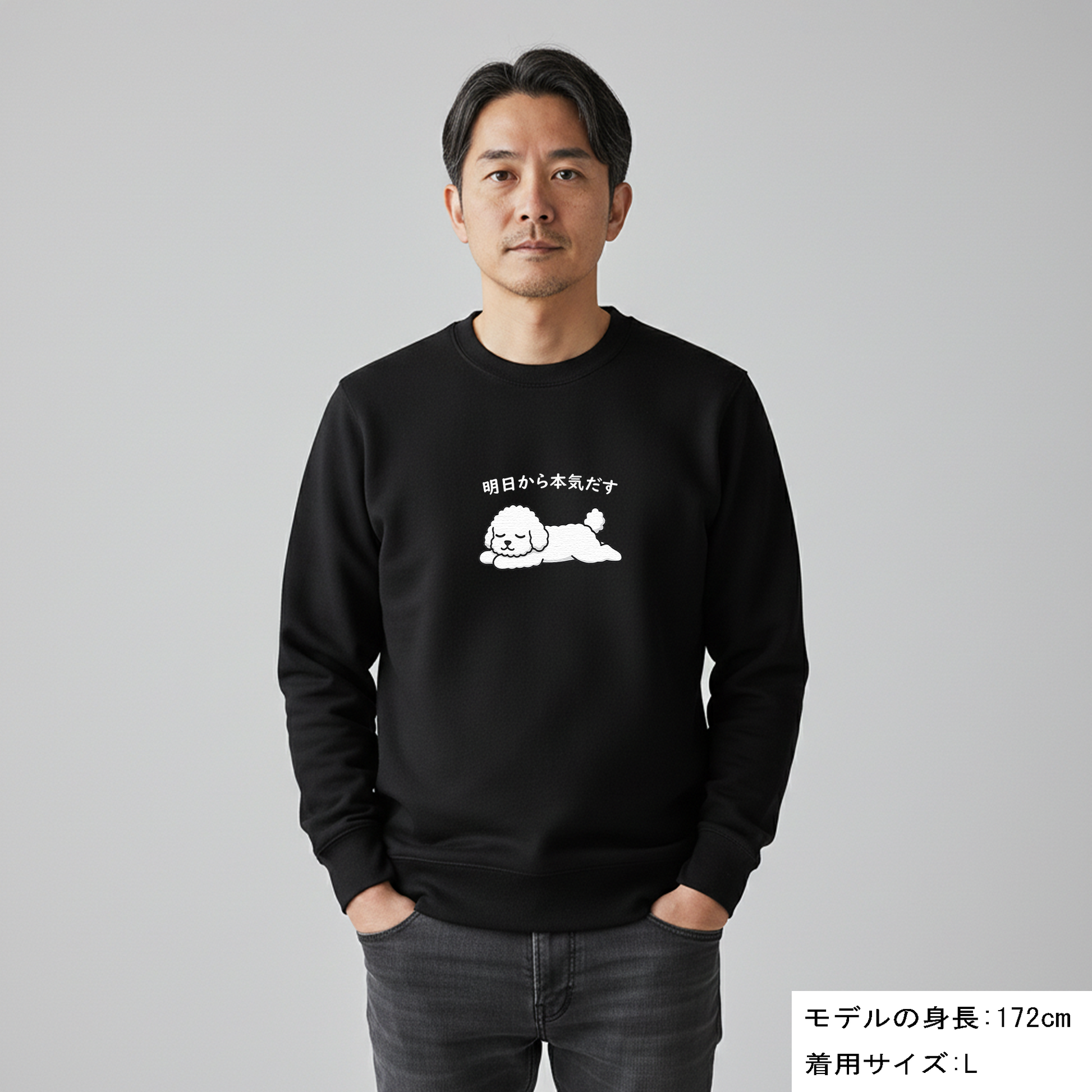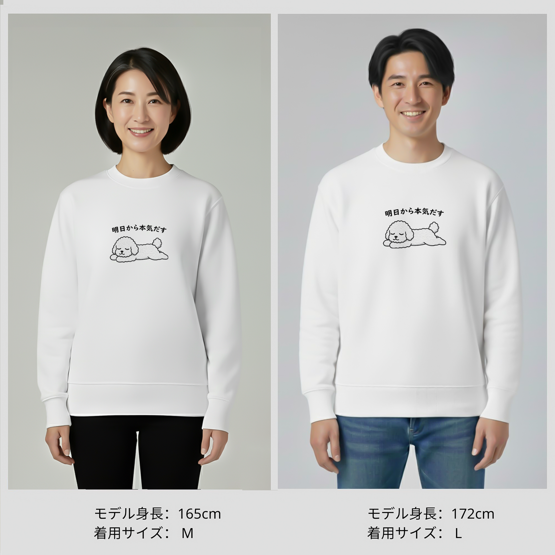 黒いTシャツに可愛いプ-ドルのイラストが、思っていた以上にとってもお洒落で気に入っています。「明日から本気だす」って言うのが、我が愛犬のキャラクターにピッタリで、クスッとしてしまいます。永遠に明日から😆